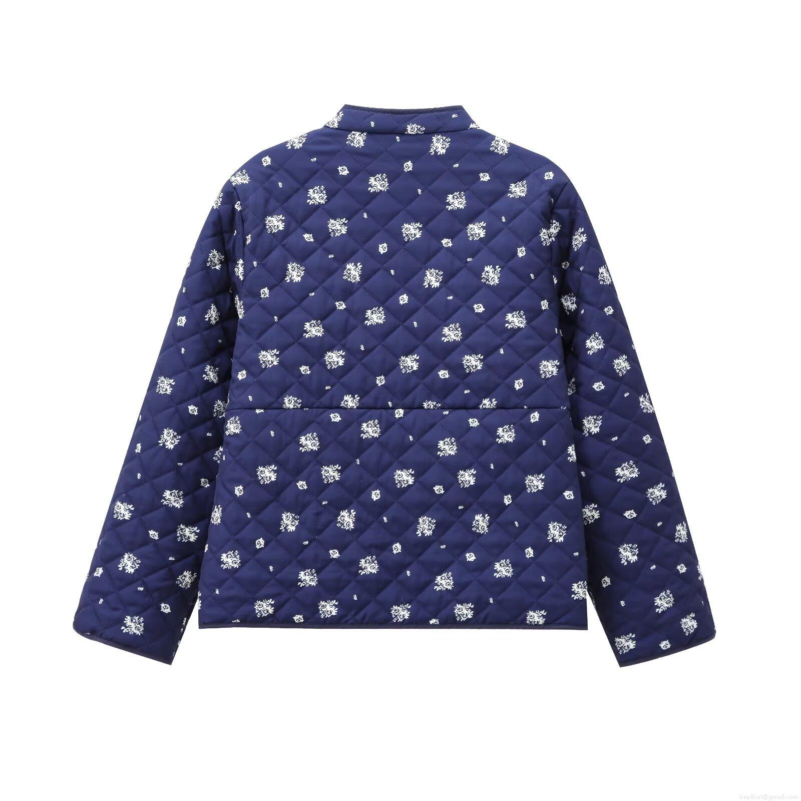 Women's Vintage Floral Quilted Jacket Navy Blue Stand Collar Padded Coat With Wood Toggle Buttons Warm Winter Streetwear Outwear
