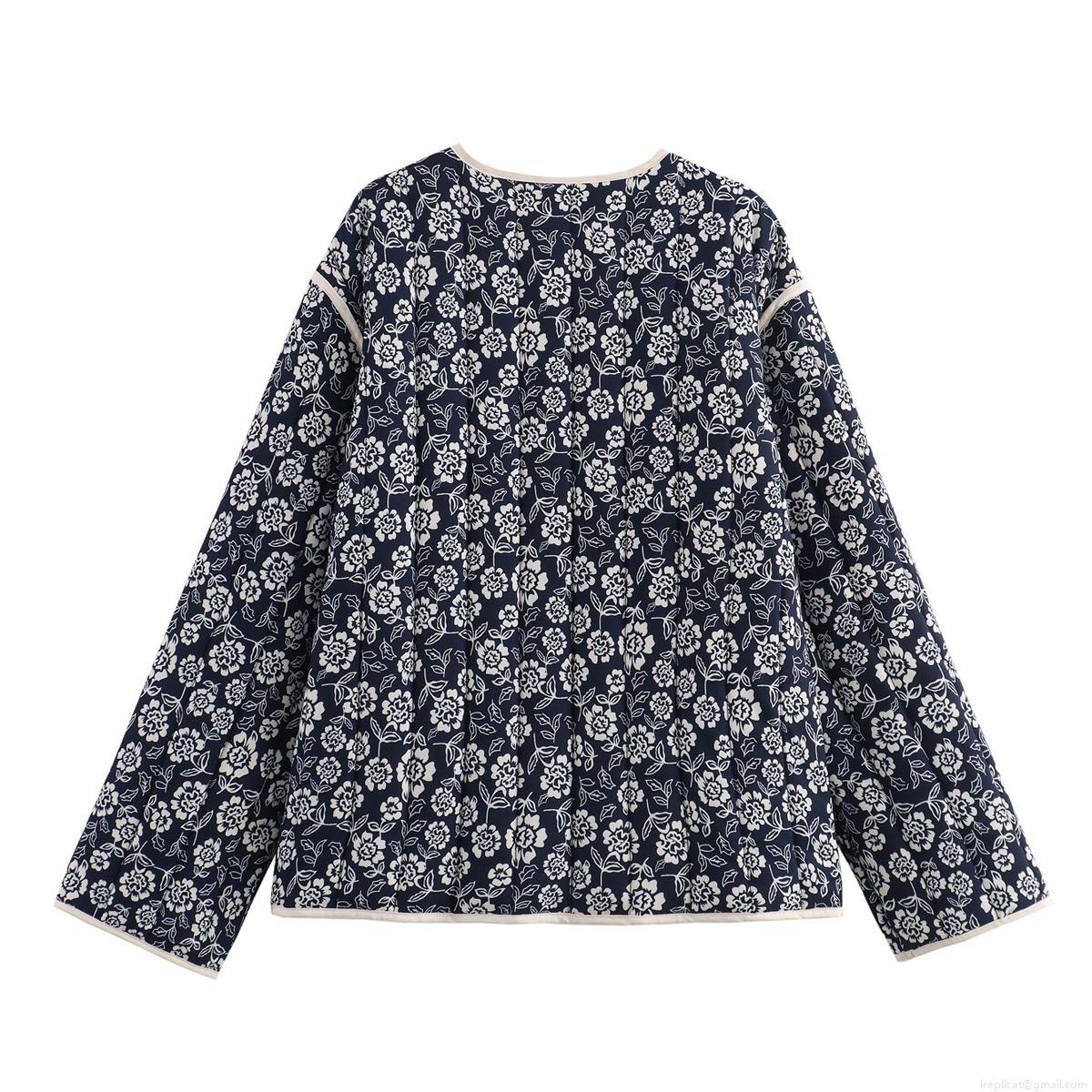 Women's Daisy Print Quilted Cotton Jacket Retro Floral Stand Collar...