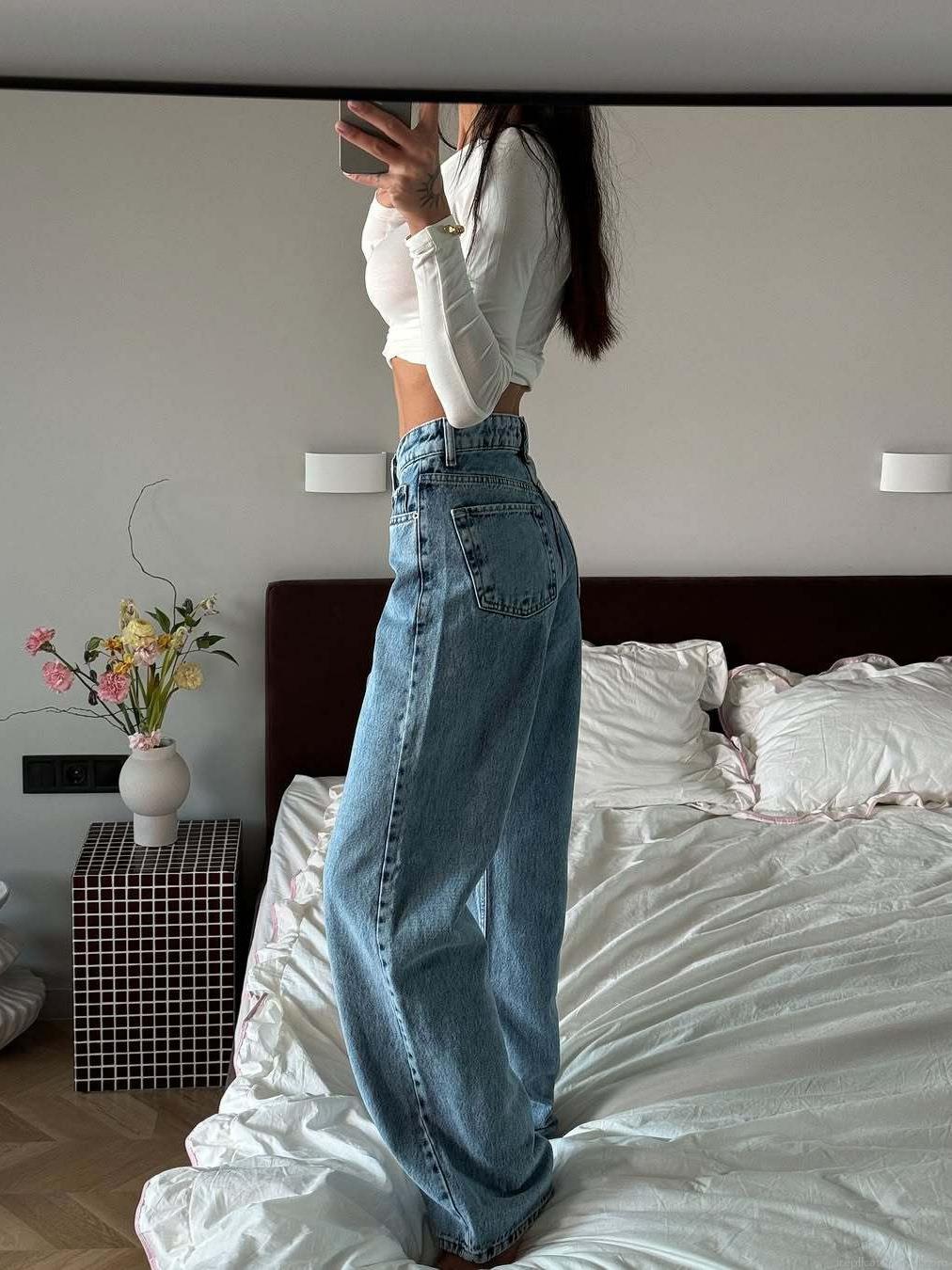 Women's Vintage High Waist Wide Leg Jeans Washed Blue 100% Cotton Denim Loose Fit Streetwear Long Pants For Women