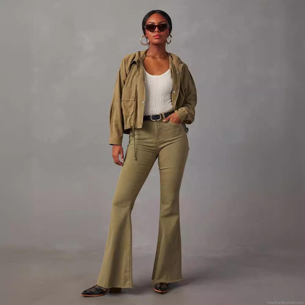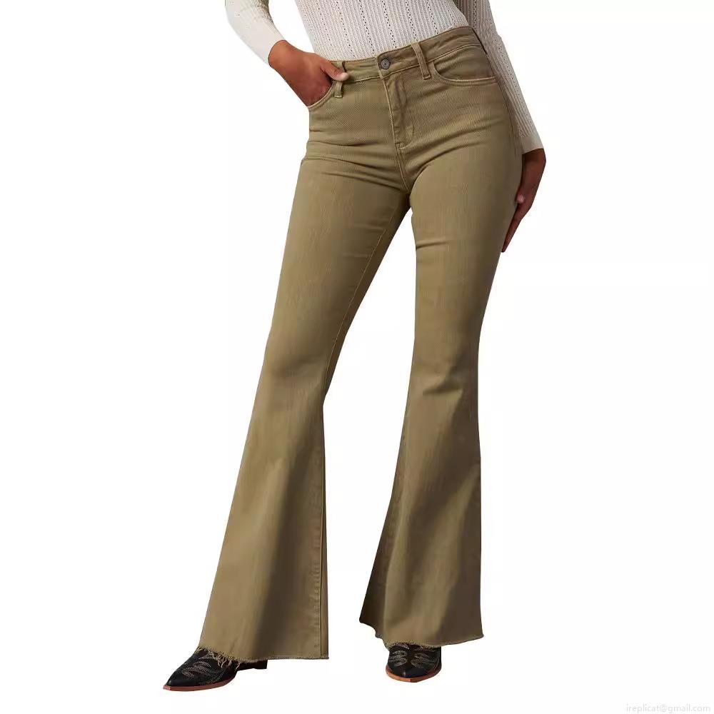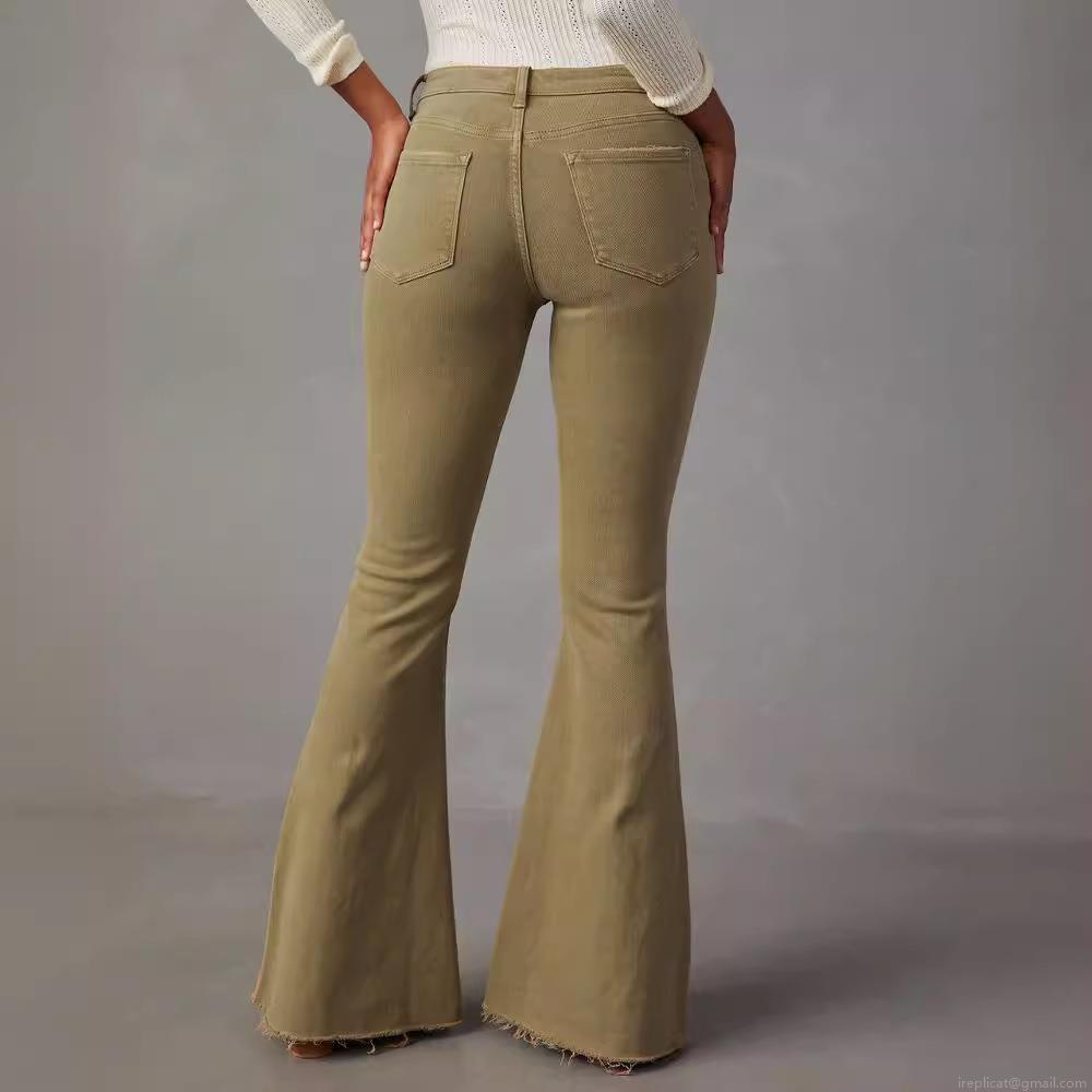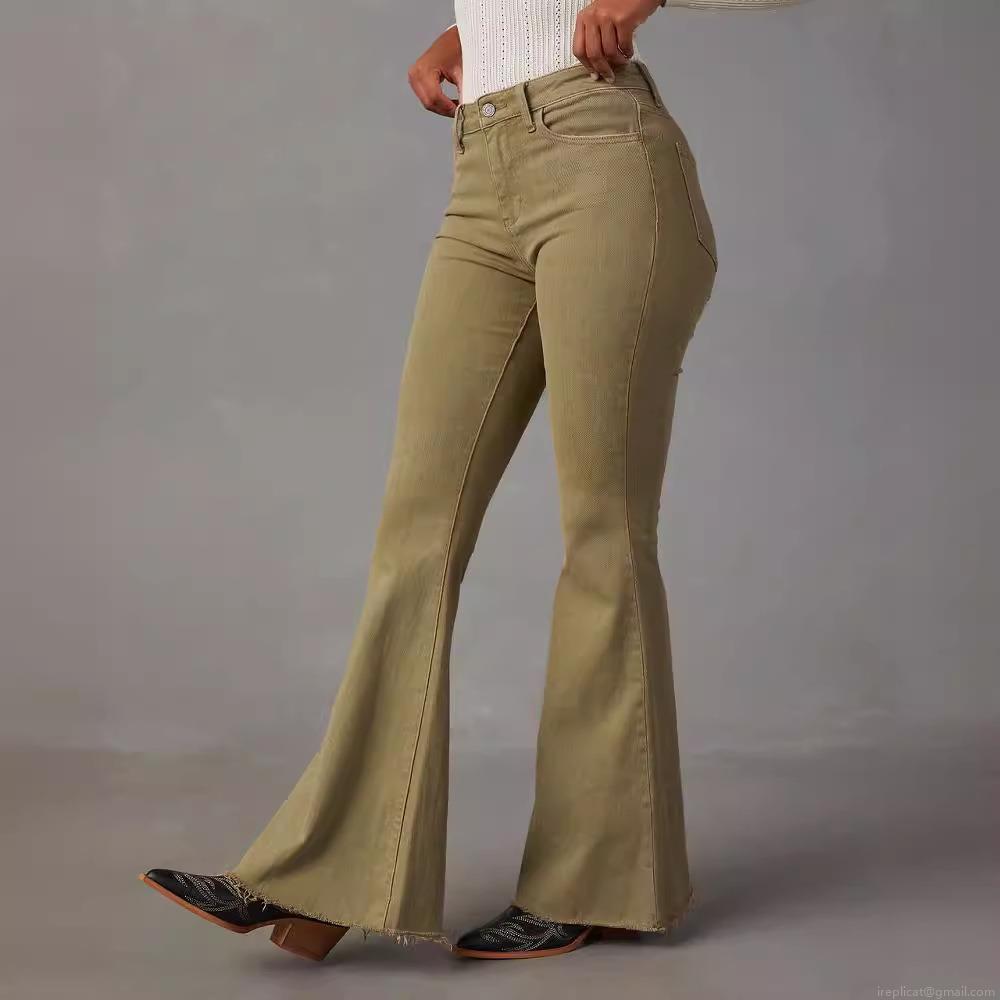 Women's Vintage High Waisted Flare Jeans Slim Fit Olive Green Denim Trousers Raw Hem Frayed Edge Bootcut Pants Retro Streetwear Casual For Ladies