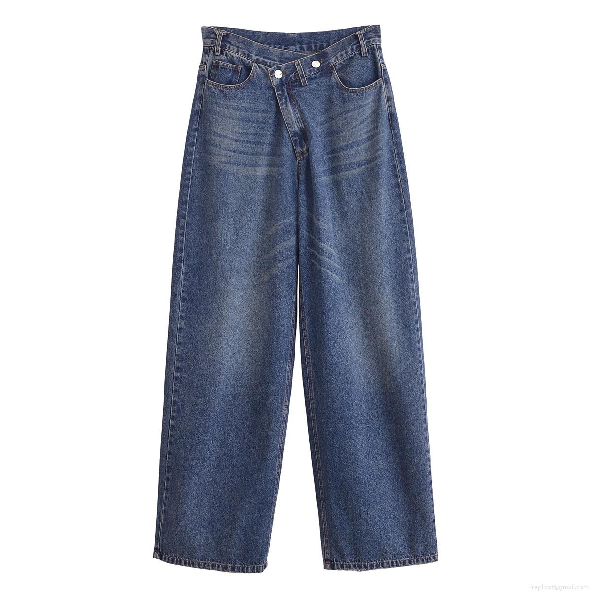 Women's Vintage High Waisted Wide Leg Jeans Asymmetric Crossover Waist Cotton Denim Washed Loose Straight Trousers Streetwear For Ladies