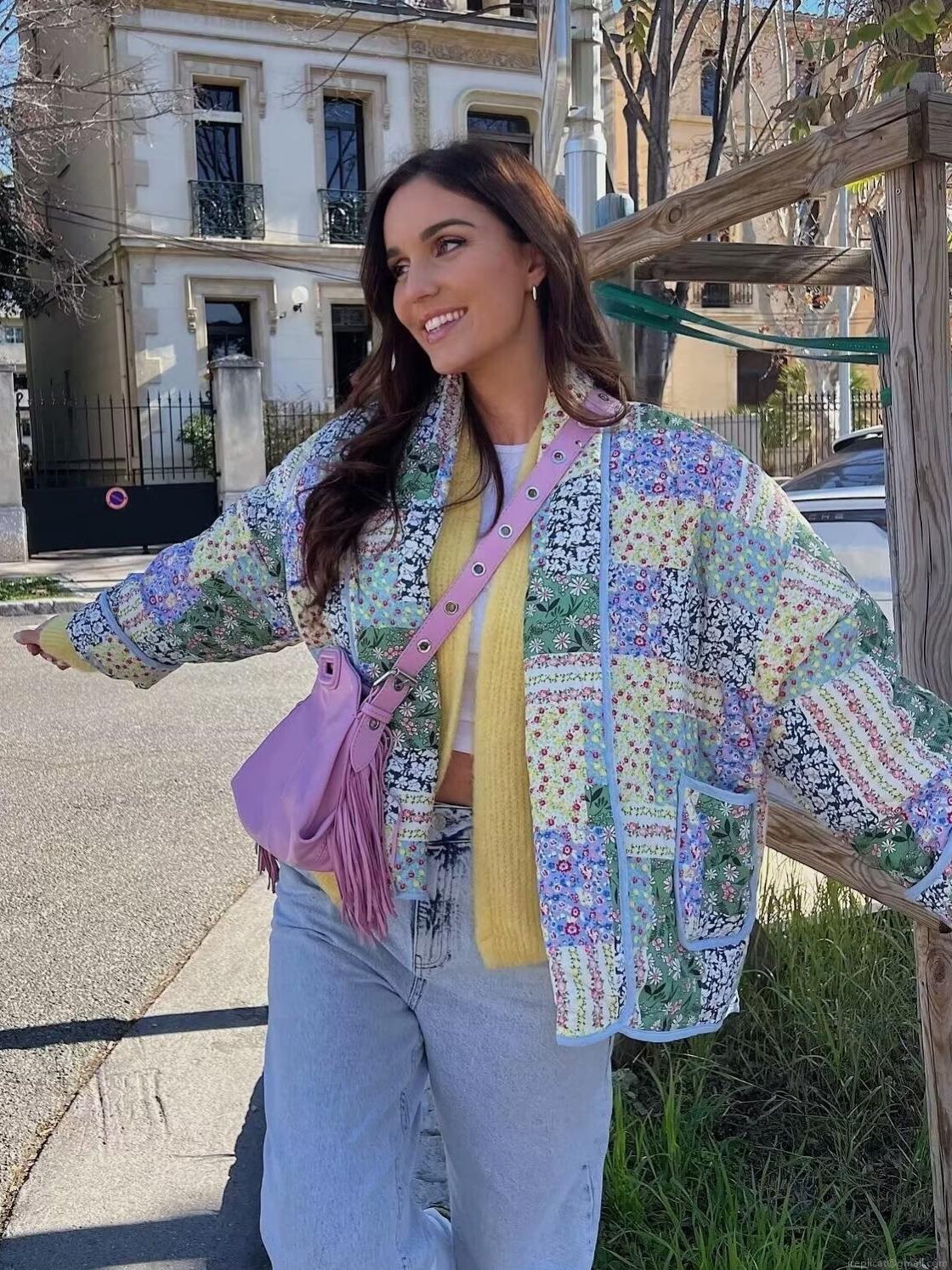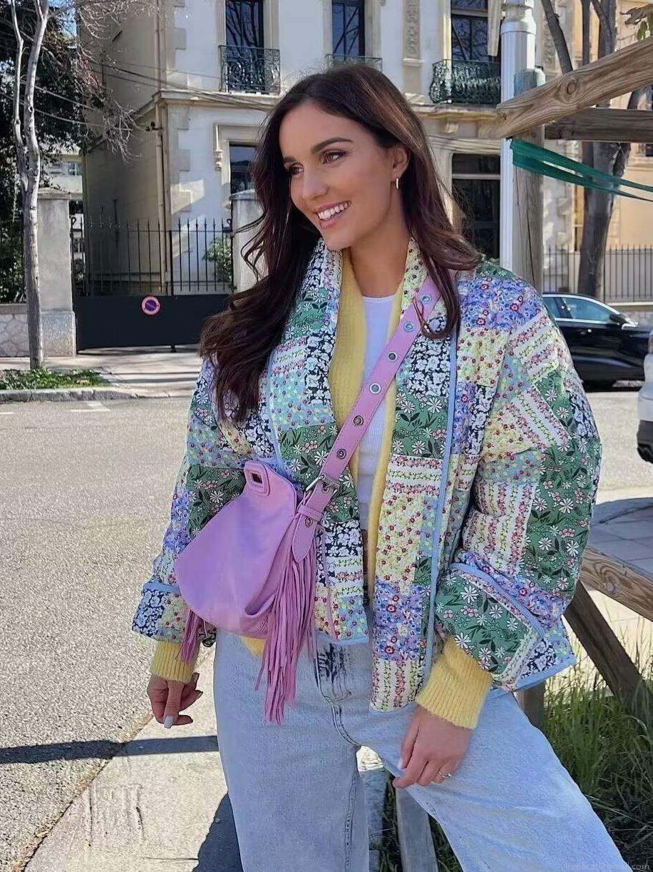 Women's Vintage Quilted Patchwork Floral Jacket Bohemian Padded Short Coat Long Sleeve V-Neck Open Front Outwear For Autumn Winter