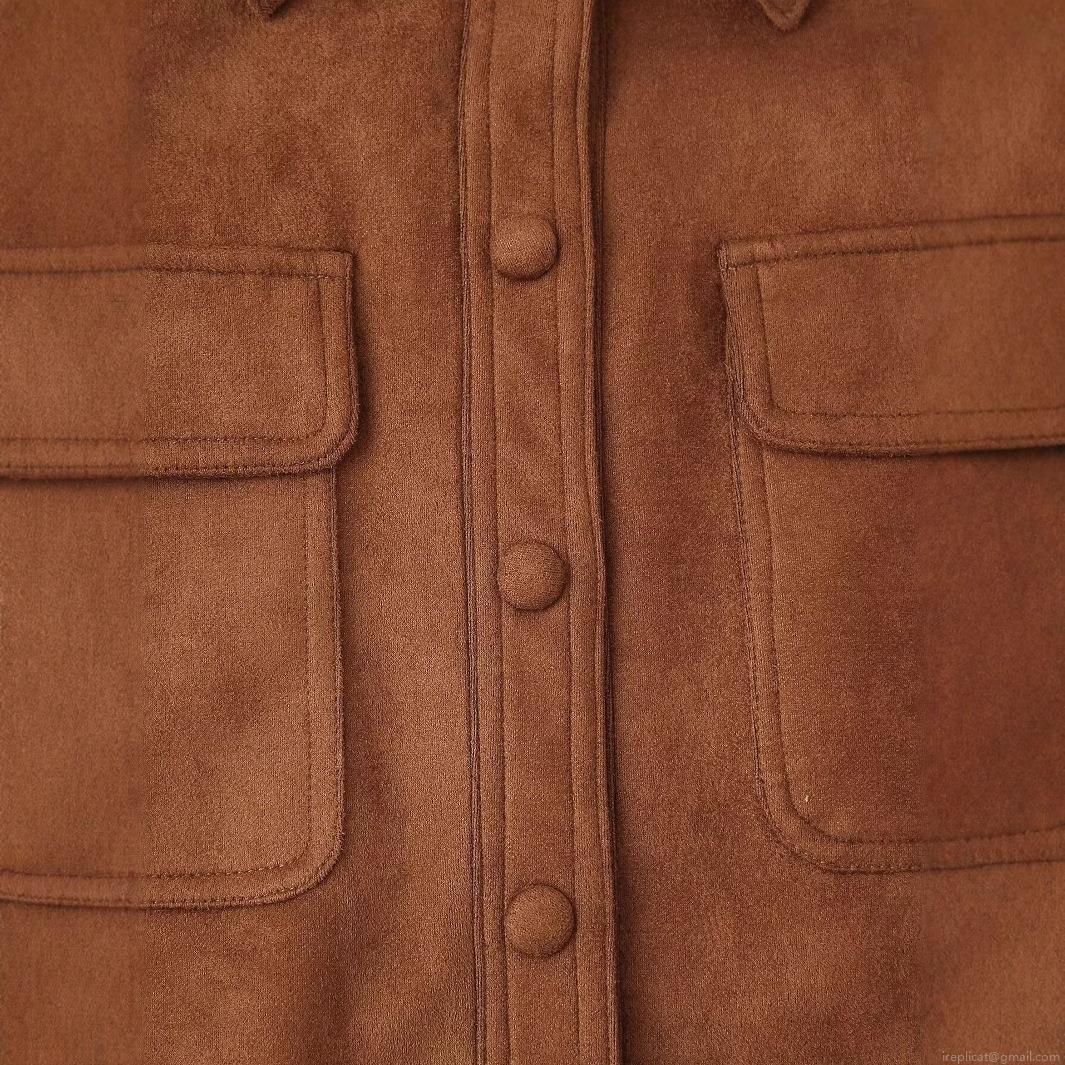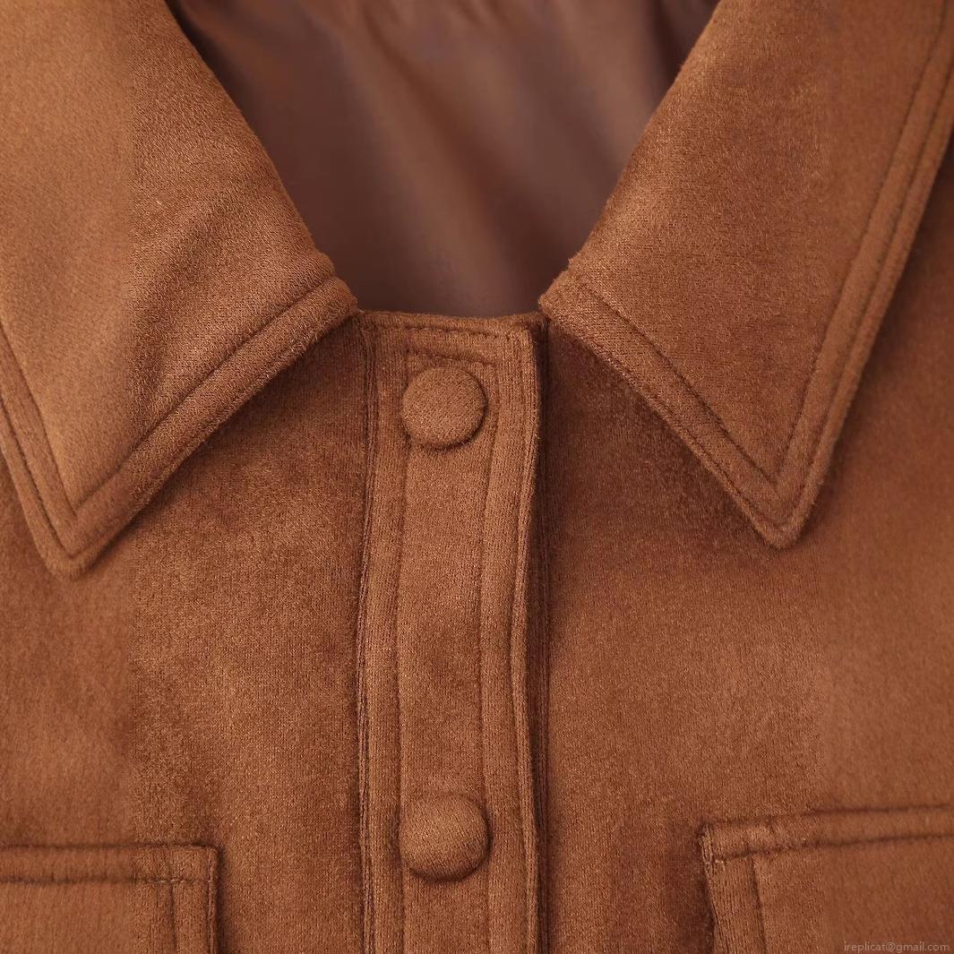 Women's Vintage Suede Leather Jacket Lapel Long Sleeve Single Breasted Bomber Coat With Chest Pockets Streetwear Fashion Outerwear