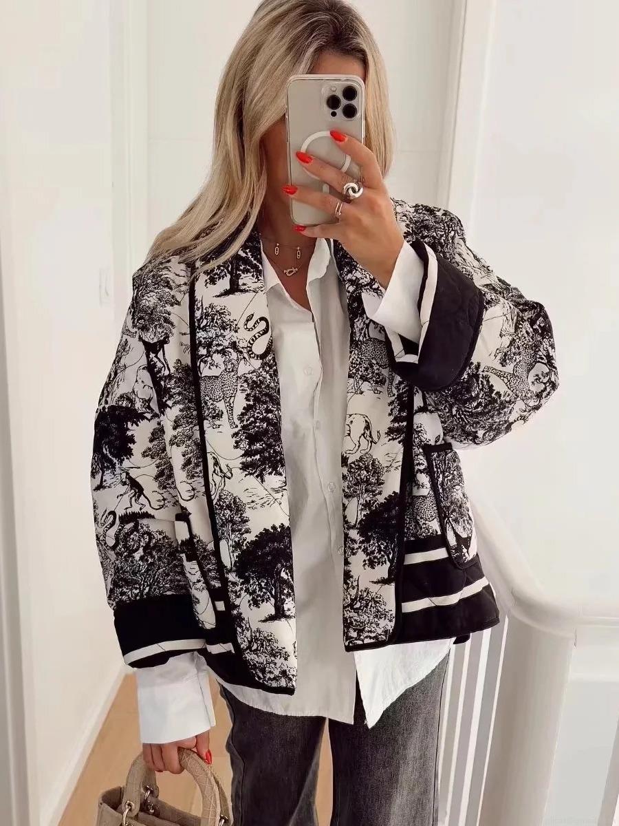 Women's Vintage Toile de Jouy Print Quilted Jacket Retro Forest Animal Pattern Cotton Padded Coat Loose V-Neck Long Sleeve Streetwear Outerwear with Double Pockets