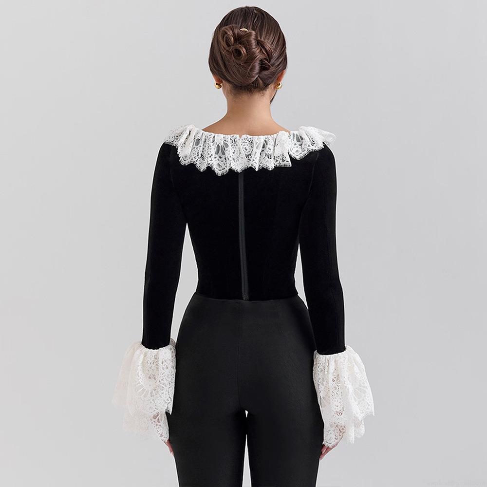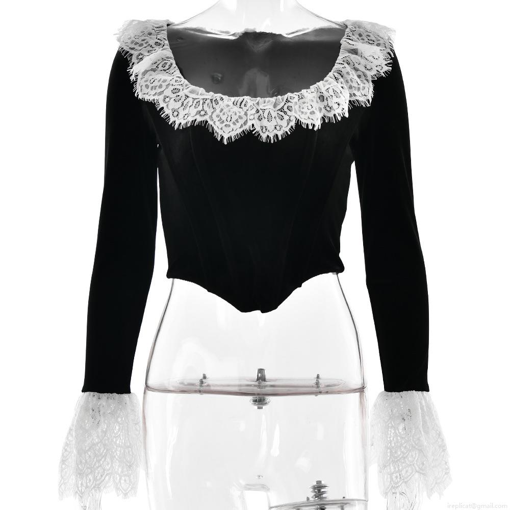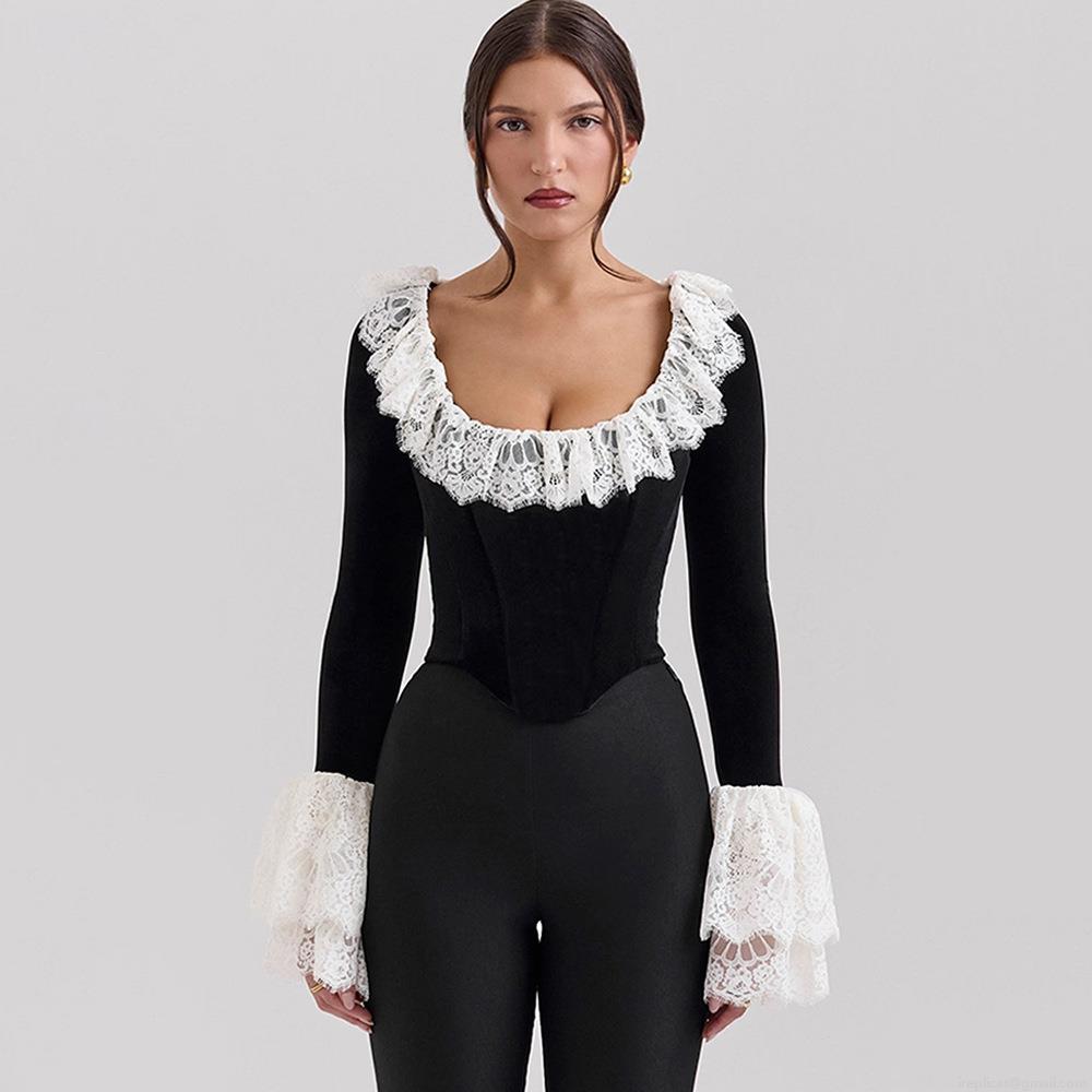 Women's Vintage Velvet Patchwork Lace Flare Sleeve T-Shirt Sexy Gothic Boning Corset Top Streetwear Party Retro U-Neck Slim Long Sleeve Top