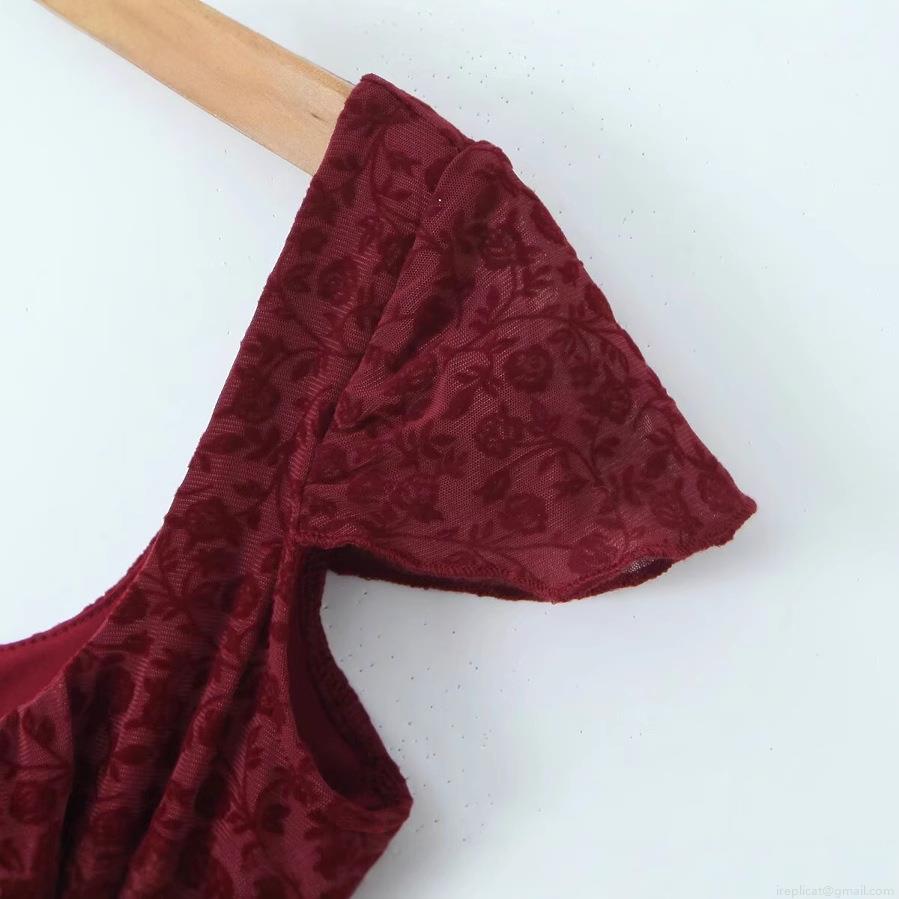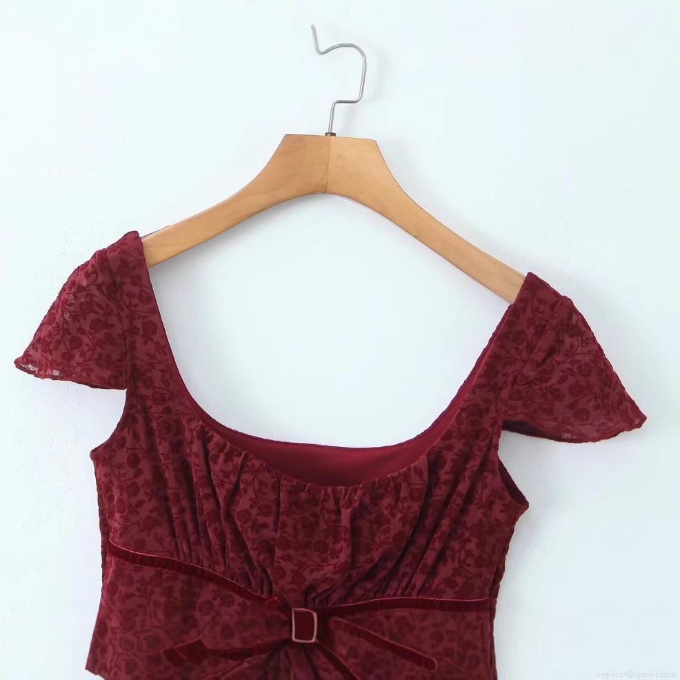 Women's Vintage Wine Red Floral Lace Short Sleeve Top Square Neck Slim Fit Bow Design Burn-out Fabric Sexy Streetwear Blouse For Women