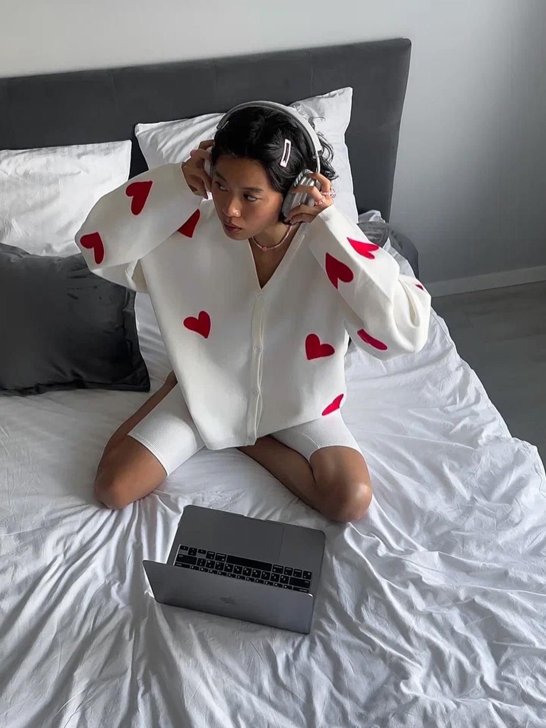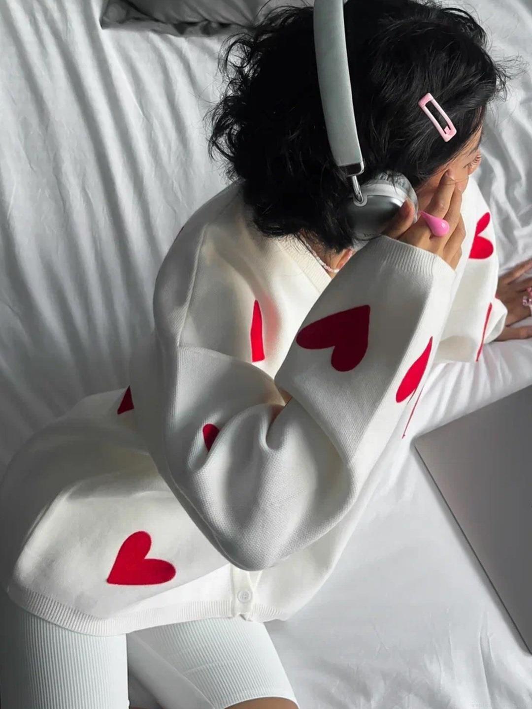 Women's V-Neck Knit Cardigan Oversized Embroidered Heart Pattern Button Up Sweater Cotton Blend Long Sleeve Loose Outerwear For Casual Chic Streetwear