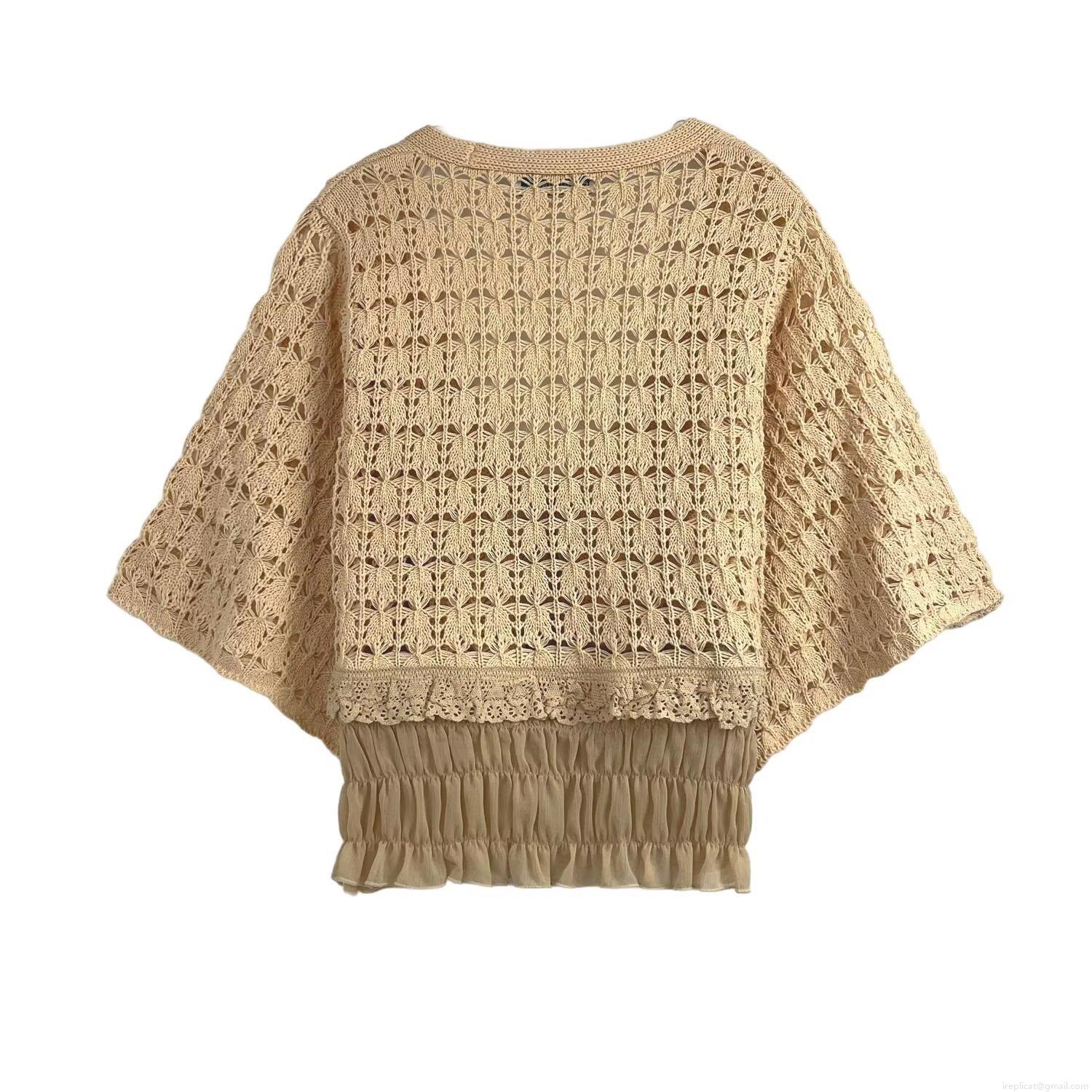 Women's V-Neck Knit Cardigan Short Sleeve Crochet Hollow Out Lace Patchwork Tie-Up Apricot Top Casual Bohemian Style Cotton Blend Sweater