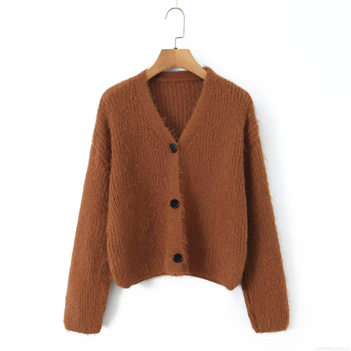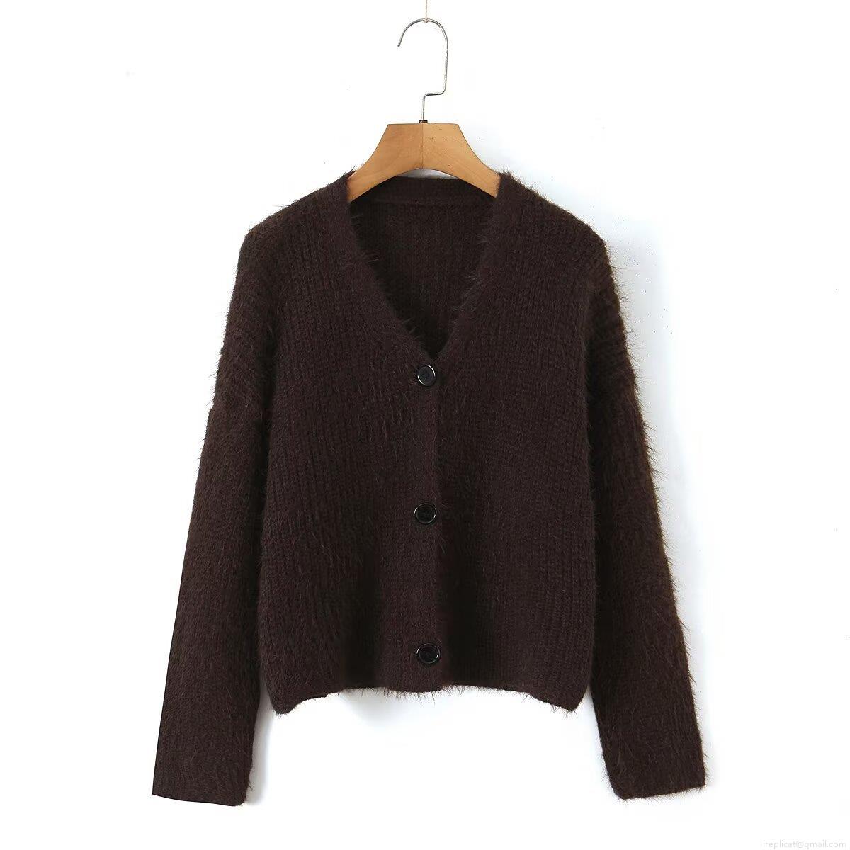 Women's V-Neck Knit Cardigan Sweater Faux Mohair Plush Single Breasted Long Sleeve Crop Top Casual Western Style Solid Color Warm Outerwear