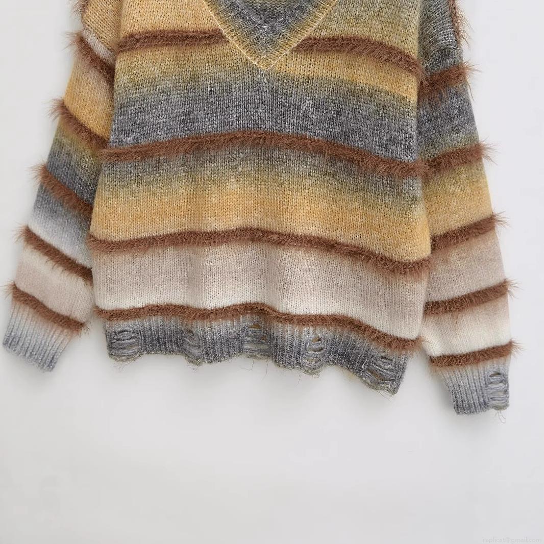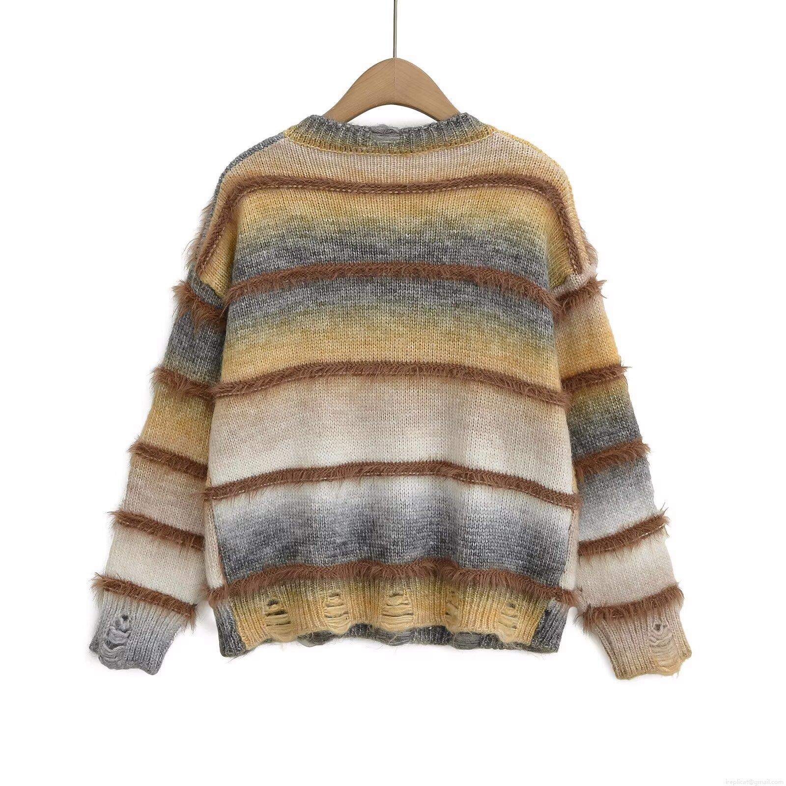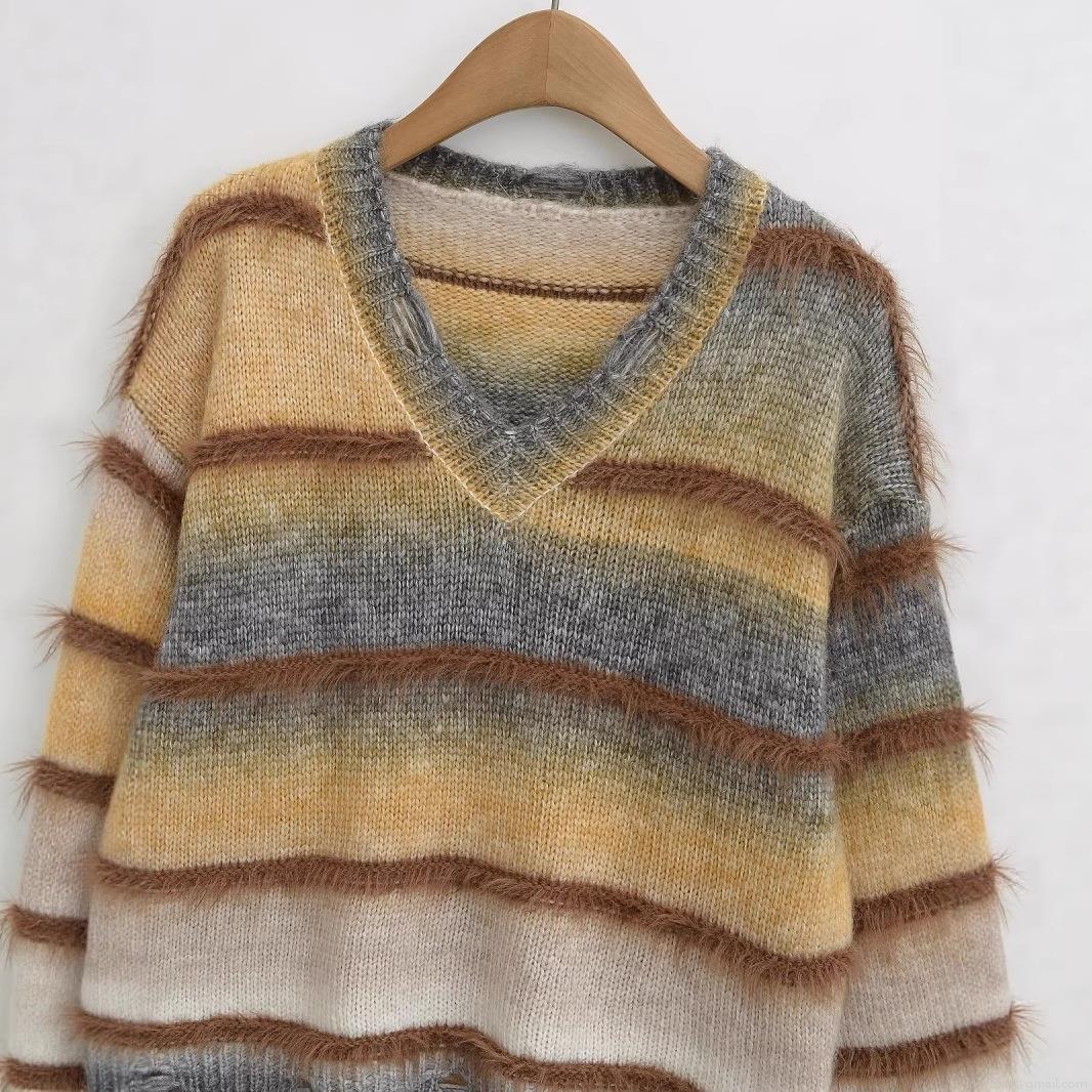 Women's V-Neck Knit Sweater Gradient Striped Distressed Ripped Shaggy Fringe Long Sleeve Oversized Lazy Style Casual Pullover Jumper Knitwear