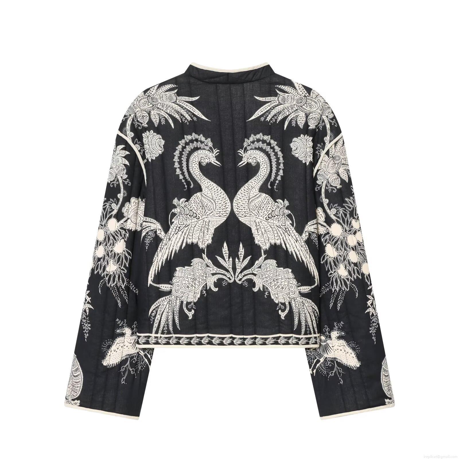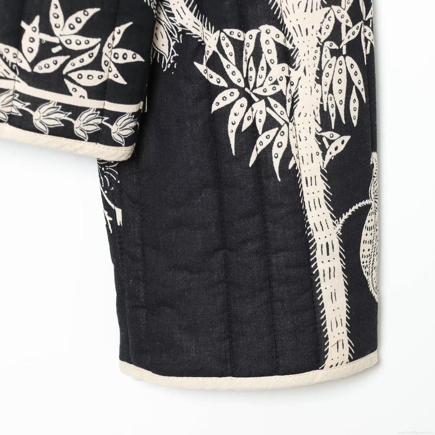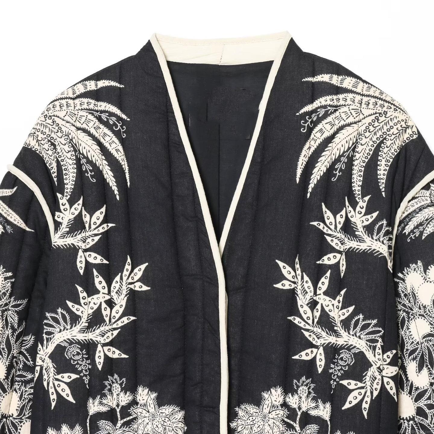 Women's V-Neck Quilted Jacket Loose Floral Palm Tree Print Casual Outerwear With Concealed Snaps Long Sleeve Warm Winter Fashion Coat