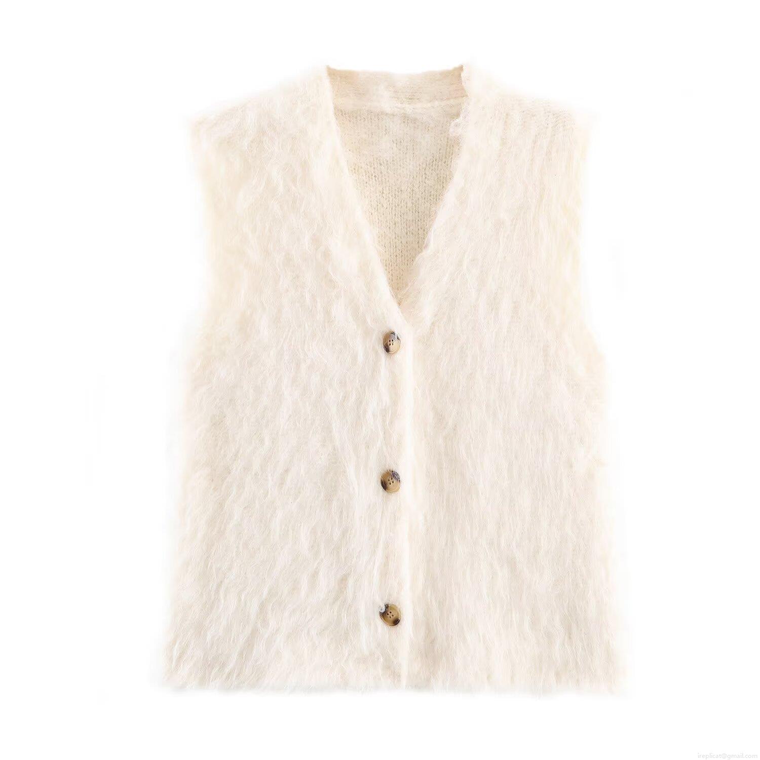 Women's V-Neck Sleeveless Knit Vest Cardigan Polyester Plush Mohair Style Solid Color Single Breasted Waistcoat For Autumn Winter Daily Wear