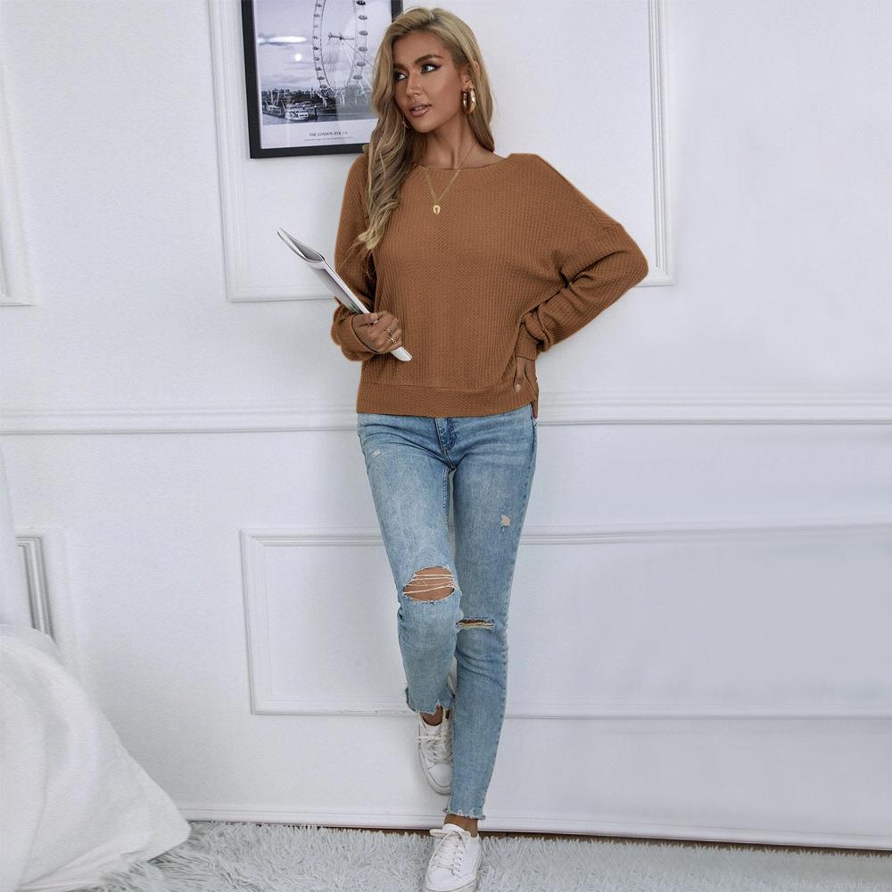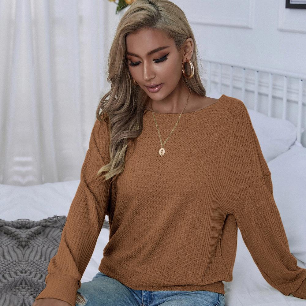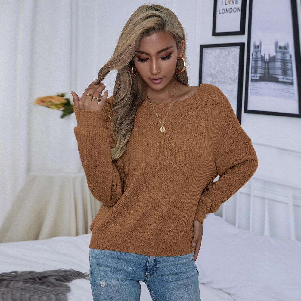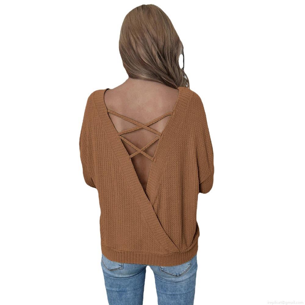 Women's Waffle Knit T-Shirt Sexy Backless V-Neck Criss-Cross Straps Long Sleeve Loose Fit Pullover Top For Autumn Winter Casual Party Fashion Brown