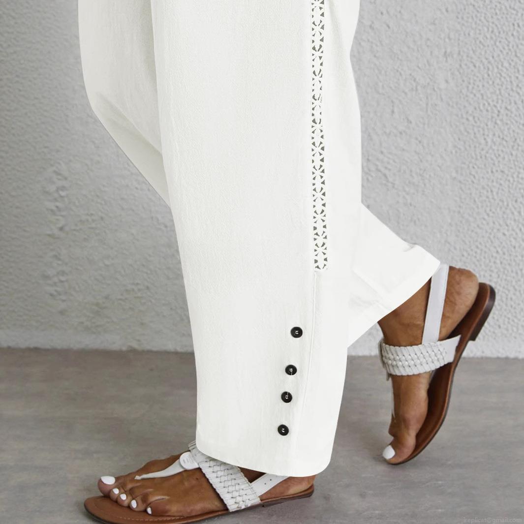 Women's Wide Leg Casual Pants Cotton Linen Texture Hollow Out Lace Trim Drawstring Elastic Waist Straight Trousers With Side Buttons For Summer Daily Commute Fashion