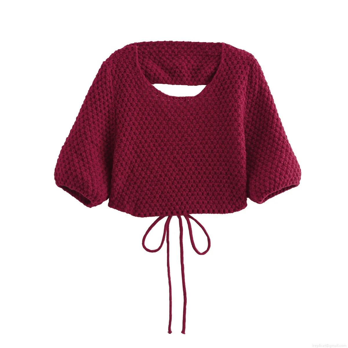 Women's Wine Red Knit Shrug Crop Top Sexy Backless Tie Detail Chunky Wool Blend Short Sleeve Loose Sweater For Streetwear Party Casual Autumn Winter