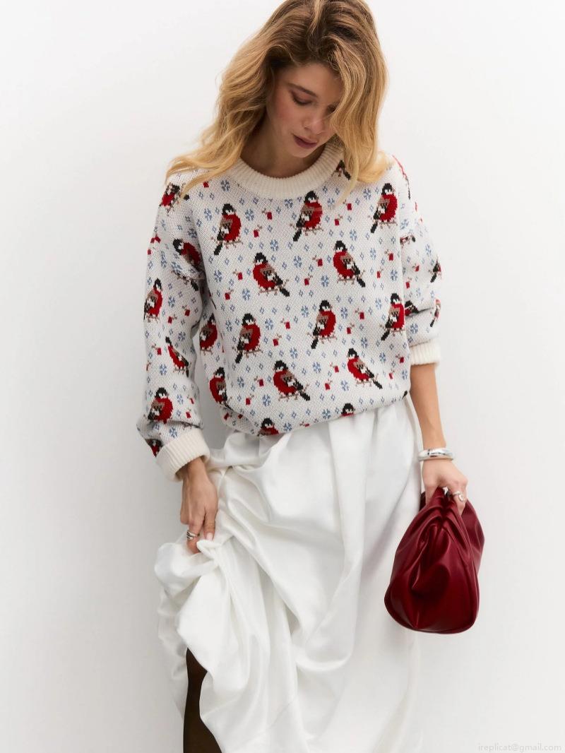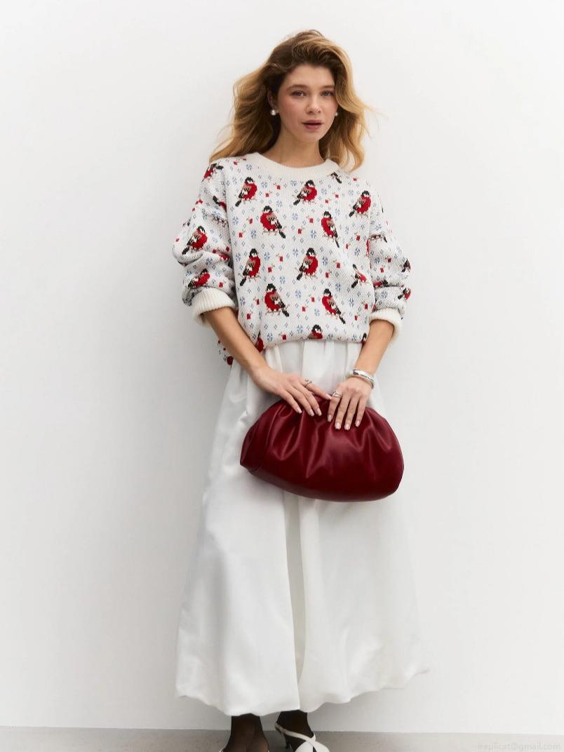 Women's Winter Jacquard Knit Sweater Elegant Red Bird Snowflake Pattern Pullover Loose Fit Core Spun Yarn Long Sleeve Crew Neck Casual Warm Winter Jumper Top